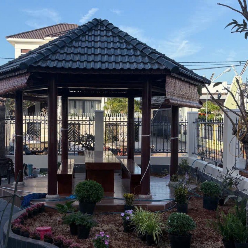 Toàn bộ kết cấu chòi lục giác gỗ Căm Xe được thi công bằng gỗ Căm Xe tự nhiên, nổi bật với độ cứng cao, khả năng chịu mưa nắng tốt và tuổi thọ lâu dài. Phần mái lợp ngói xanh hiện đại, giúp công trình chòi gỗ sân vườn vừa giữ nét truyền thống vừa mang dáng vẻ sang trọng, phù hợp điều kiện khí hậu tại Đắk Lắk và khu vực Tây Nguyên.